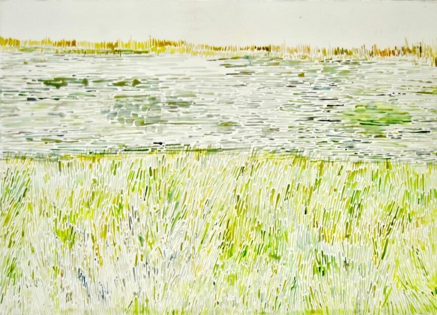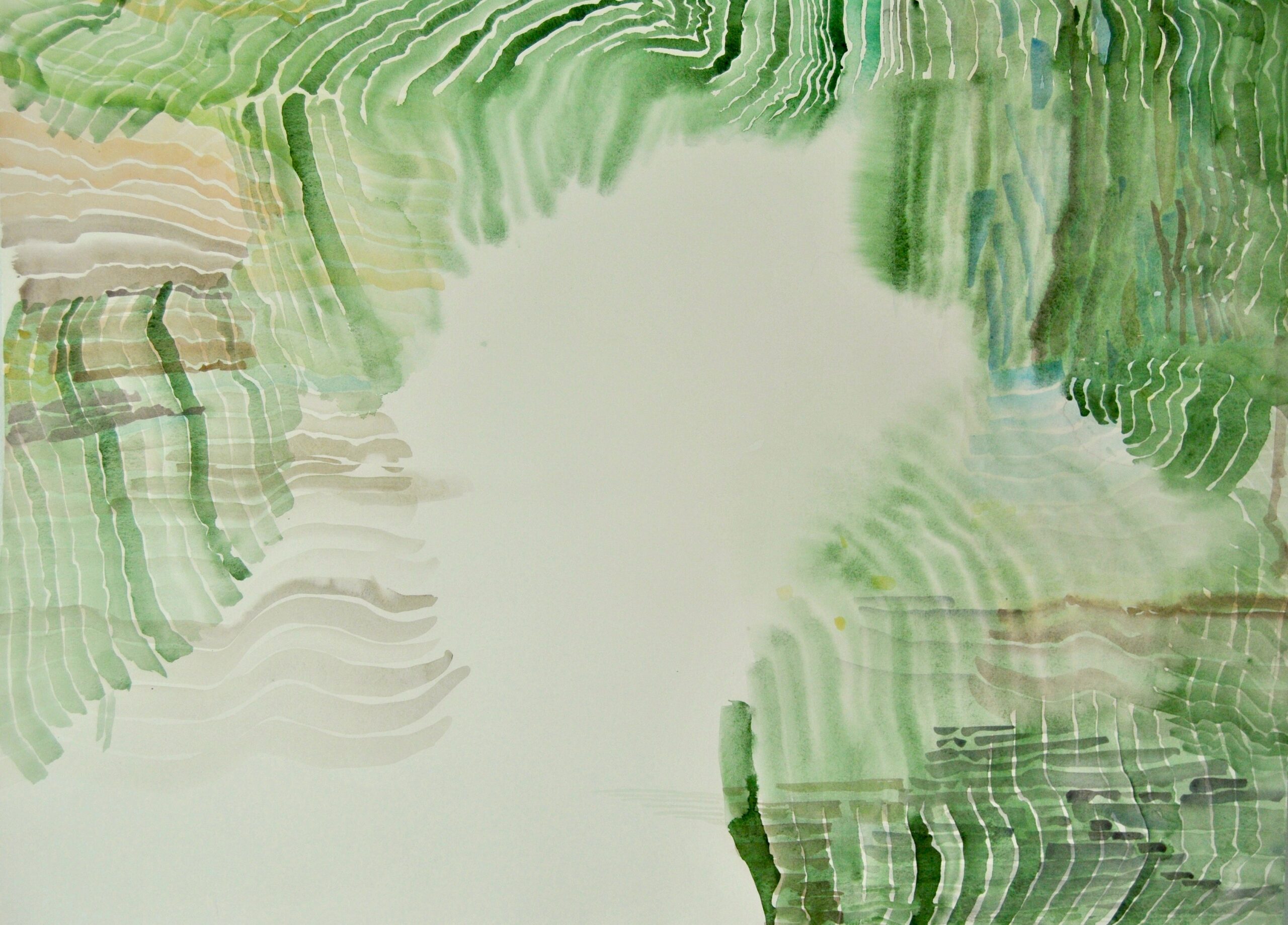 Landskapet och deras förändringar är åtminstone närvarande i mina tankar. Till mig bekant Kumo älv med sina invasiva arter, såsom jättegrö, blir smalare nära vissa stränder, så att lövträd redan börjar växa i den ruttnande vassmassan. Förutom vatten teman inspireras jag av stadslivet och observationer från slingrande rutter från hemmet till ateljen, rutter som växlar mellan kantiga, tättbebyggda förorter och ändå, till all lycka, överraskande naturliga skogsdungar.
