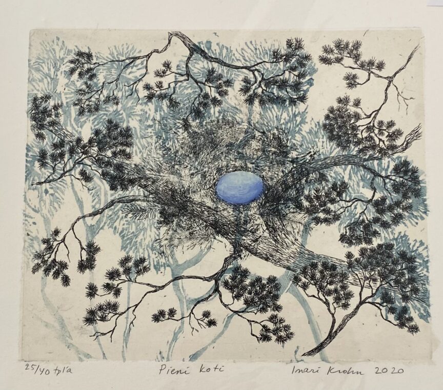Kuvassa Irina Krohnin teos ”Pieni koti” 24/40, viivasyövytys, puupiirros, chine collé. 2020.